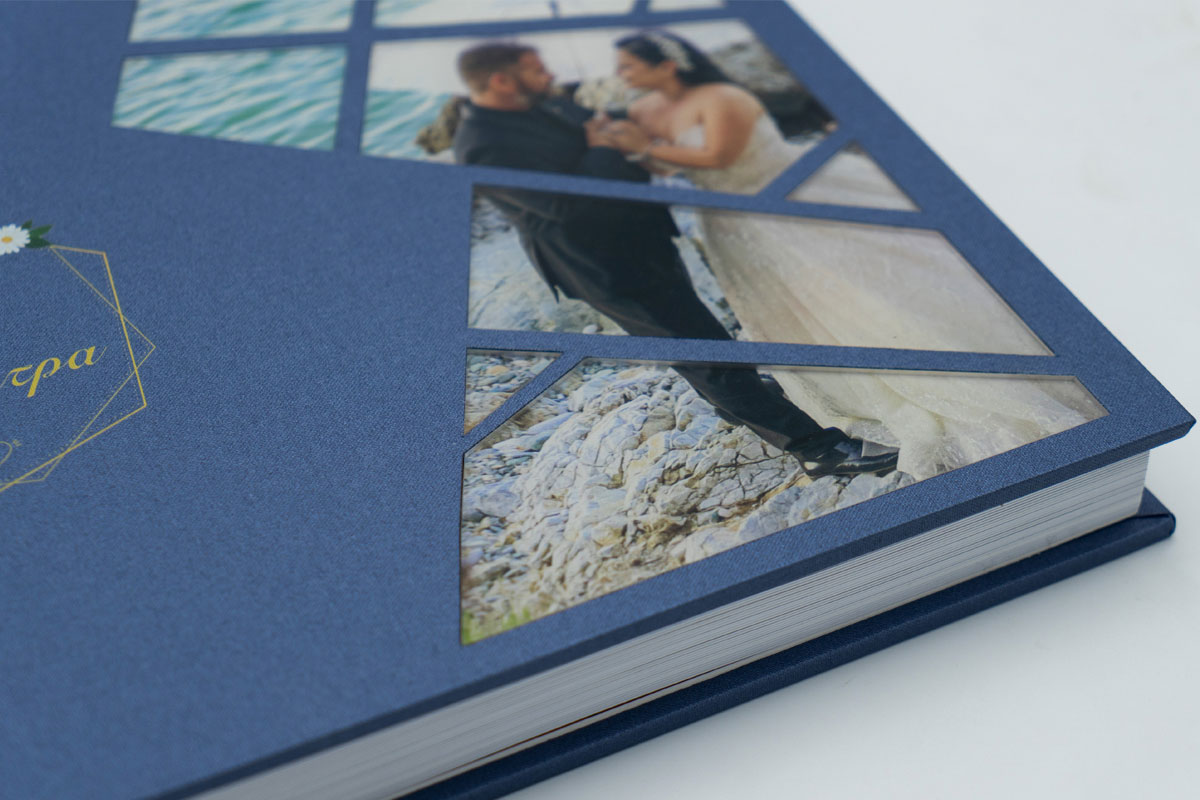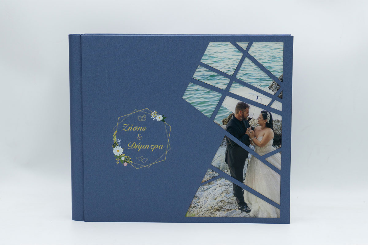 Άλμπουμ γάμου σε διάσταση 30×40 με φωτογραφία τυπωμένη σε plexiglass κομμάτια σε ένα γεωμετρικό σχέδιο. Υπάρχει και η δυνατότητα uv εκτύπωσης στην δερματίνη το όνομα και η ημερομηνία.
