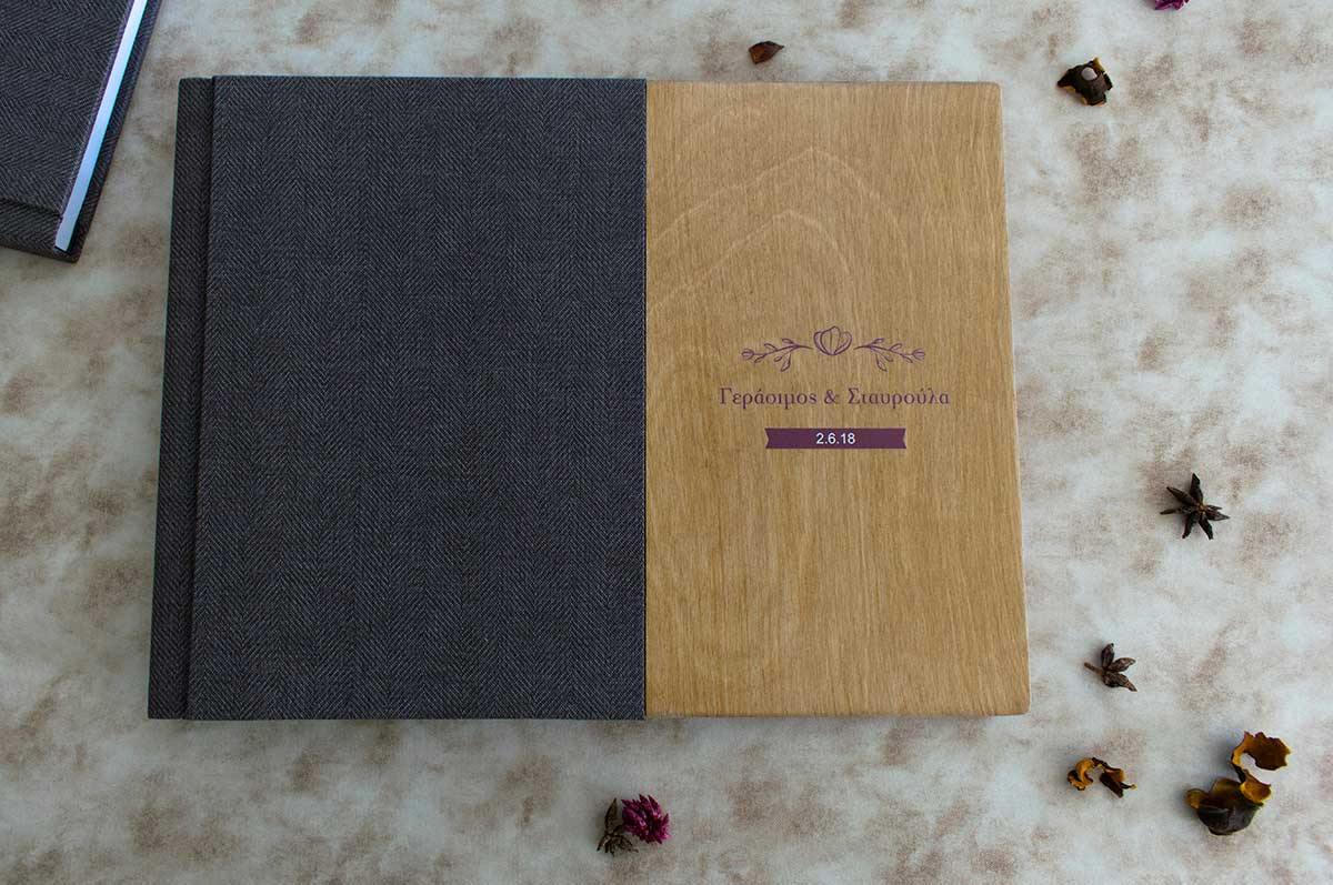 Άλμπουμ γάμου σε διάσταση 30×40 μισό ξύλο μισό δερματίνη.Το ξύλο σε δρυς απόχρωση με εκτύπωση uv το γραφικο της επιλογής σας.