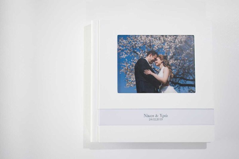 Άλμπουμ γάμου διάσταση 30×40 με λευκή δερματίνη φωτογραφία παράθυρο και λευκη λοριδα πλαστικοποιημένη με τα ονόματα και την ημερομηνία.