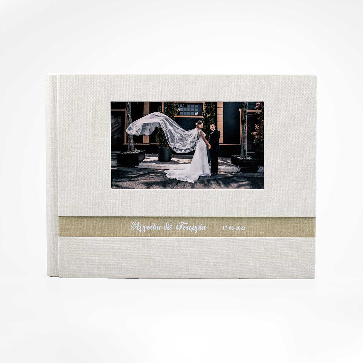 Άλμπουμ γάμου διάσταση 30×40 με φωτογραφία παράθυρο και ξύλινη λορίδα με εκτύπωση UV τα ονόματα και την ημερομηνία.