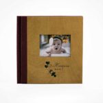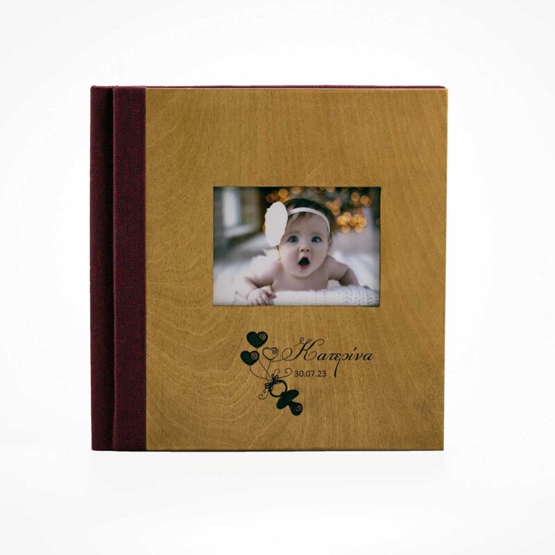 Άλμπουμ βάπτισης με ξύλινο εξώφυλλο σε διάσταση 30×30. Φωτογραφία παράθυρο και laser το όνομα και το γραφικο της επιλογής σας.