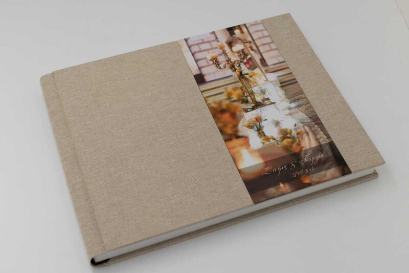 Μία κομψή επιλογή για άλμπουμ γάμου ή βάπτισης με φωτογραφία κάθετη και λινό ύφασμα σε natural απόχρωση.